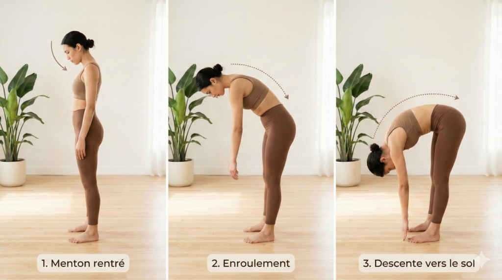 - Enroulez la colonne vertèbre après vertèbre vers le sol, en gardant le poids du corps légèrement vers l’avant.