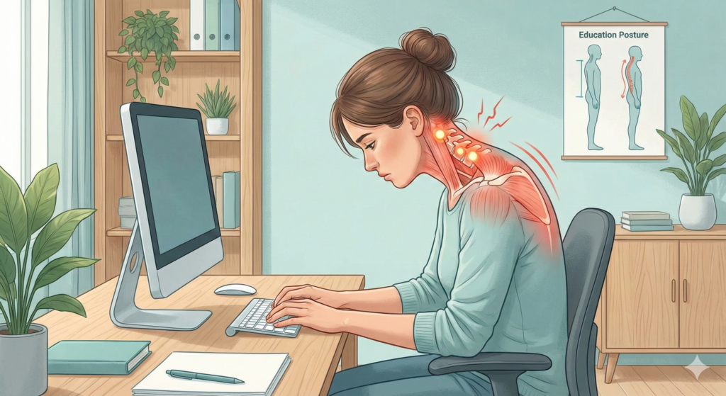 - La position penchée vers l’avant : Consulter un smartphone ou taper sur un clavier d’ordinateur portable incite à arrondir le haut du dos et projeter le menton.